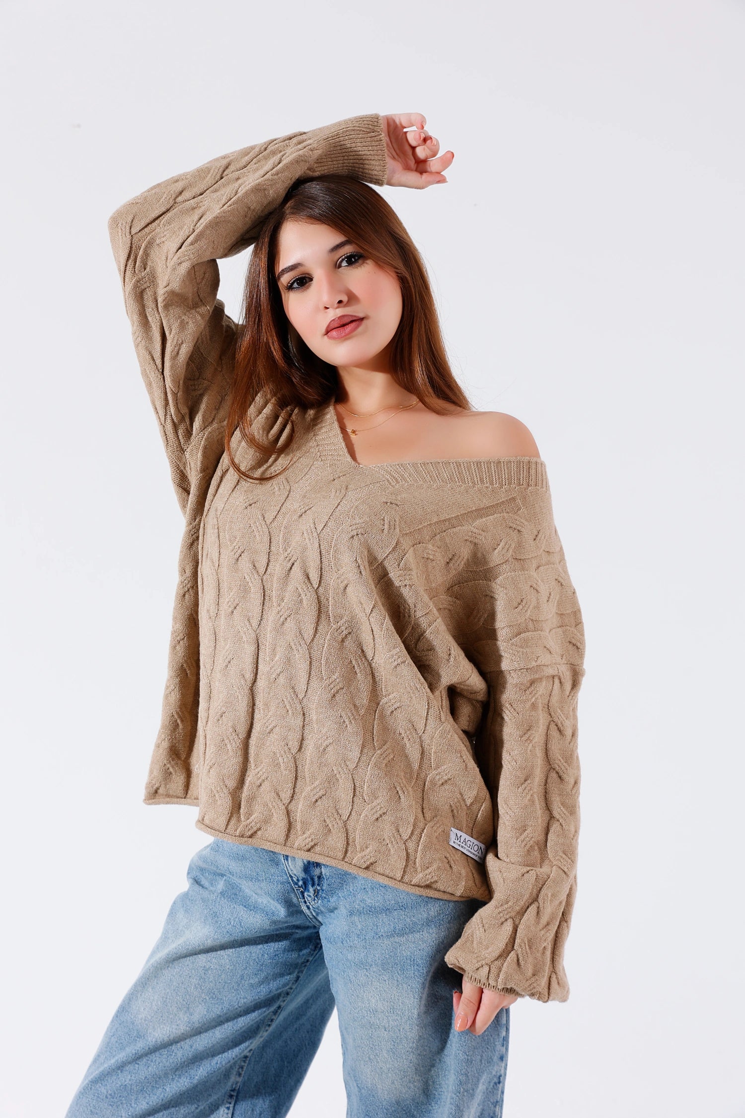 This trendy oversized V-neck sweater with a cute shoulder cut is giving effortless style & cozy vibes.